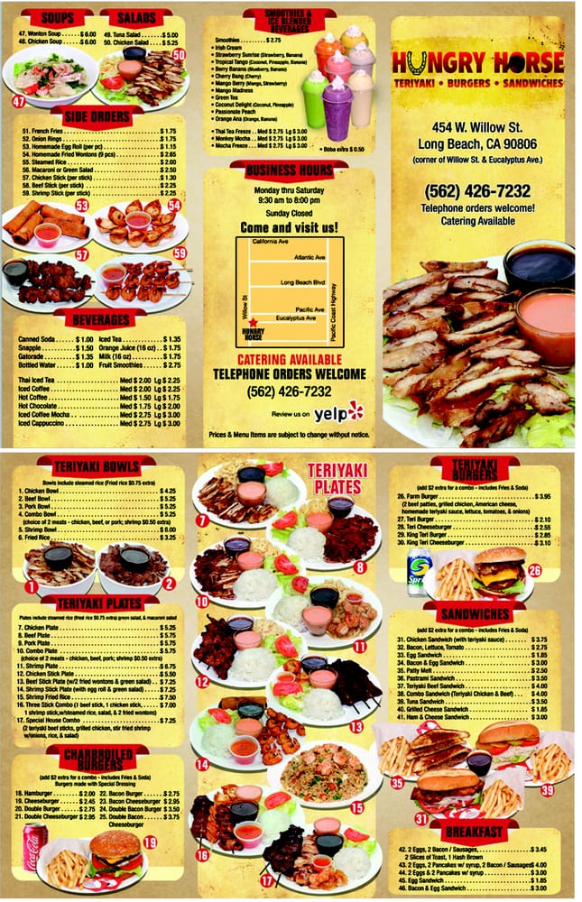 Hungry Horse Drive-In is a popular fast-food spot in Long Beach, CA, offering a diverse menu of burgers and Japanese-influenced dishes. With a casual setting and options for takeout, reservations, and catering, this drive-in is known for its tasty teriyaki, burgers, and combo plates. Customers rave about the fresh and flavorful food, including favorites like the teriyaki chicken, beef, and shrimp combo, cream cheese wontons, and grilled chicken plates. The affordable prices and fast, friendly service make Hungry Horse Drive-In a go-to for satisfying meals on a budget. Don't miss out on their ice blended boba drinks and generous portions. Whether you're a longtime patron or a newcomer, this hidden gem is worth a visit for quality food and support for local businesses.